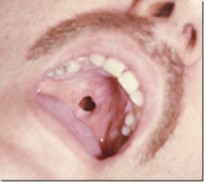 Um paciente com 36 anos sentiu que em duas semanas uma perfuração em seu palato duro estava lentamente aumentando. Ele era usuário de cocaína e o defeito já tinha cerca de 3 milímetros de diâmetro.