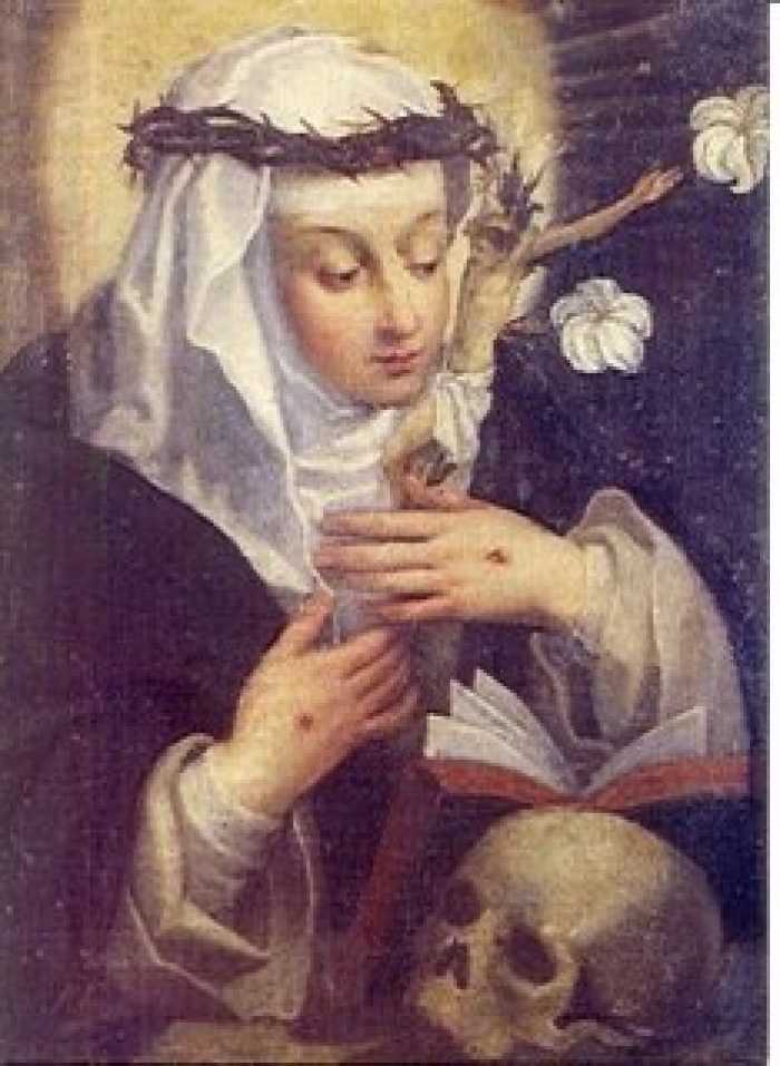 Santa Catarina de Siena que aos 15 anos, após a morte de sua irmã e diante de projetos futuros de casamento, iniciou restrição alimentar, preces e práticas de auto-flagelamento, chegando a induzir vômito através de ervas e galhos na garganta quando forçada a alimentar-se. Catarina havia feito um voto de castidade quando ainda era criança. A inanição haveria gerado um estado psicológico de constante vigília e experiências místicas, vindo a falecer de desnutrição aos 32 anos. - Foto: Divulgação.